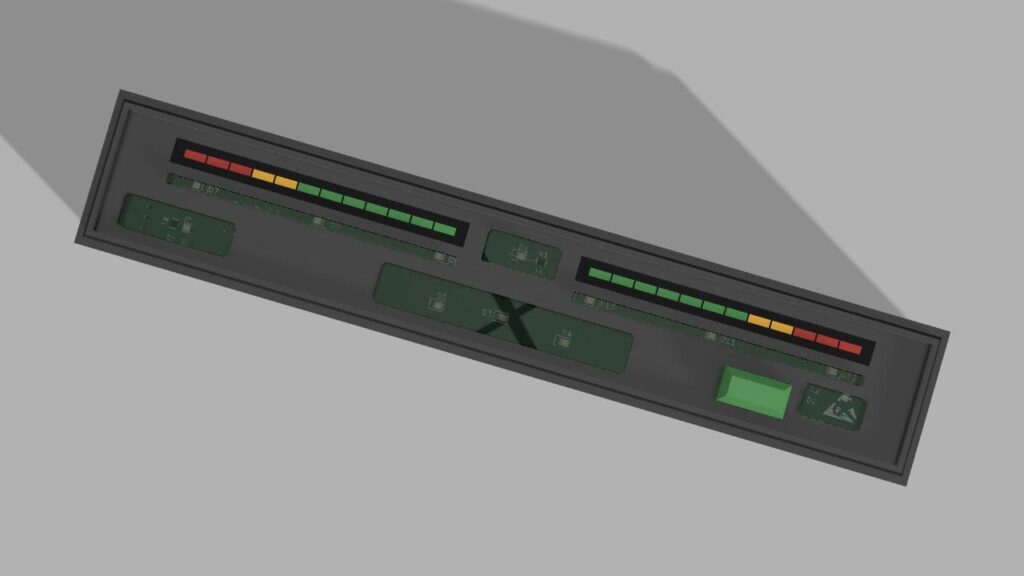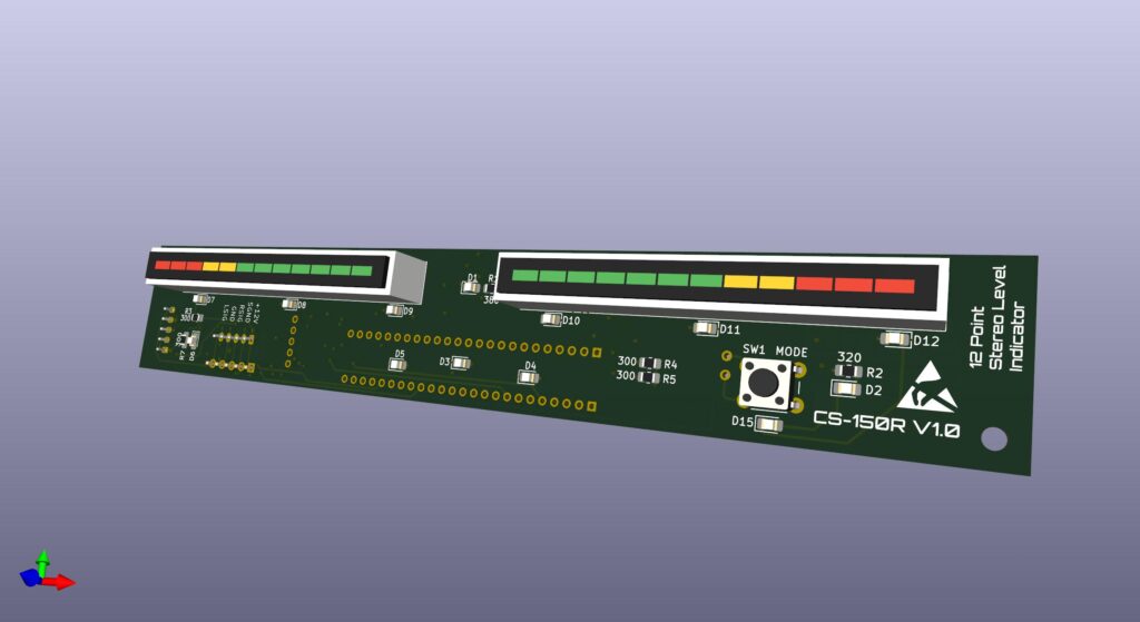 12個の0805 LEDを実装しました。バックライトの役割を果たします。左右のレベルメーターが横に並ぶようにしっかりアラインメントを取りました。JSTコネクタを2つ搭載しました。INとRETで2つのレベルメーターをチェーン接続することが可能です。